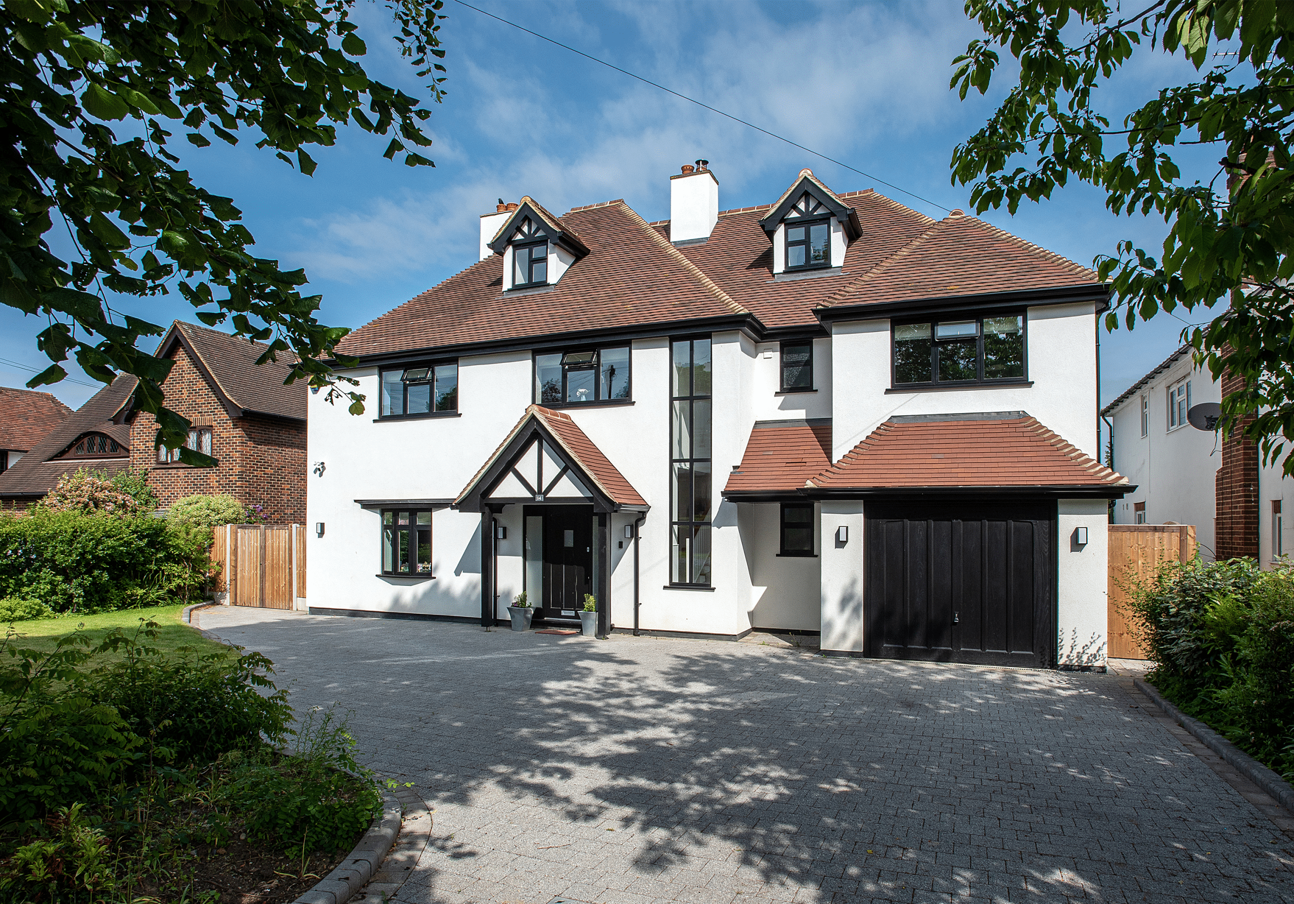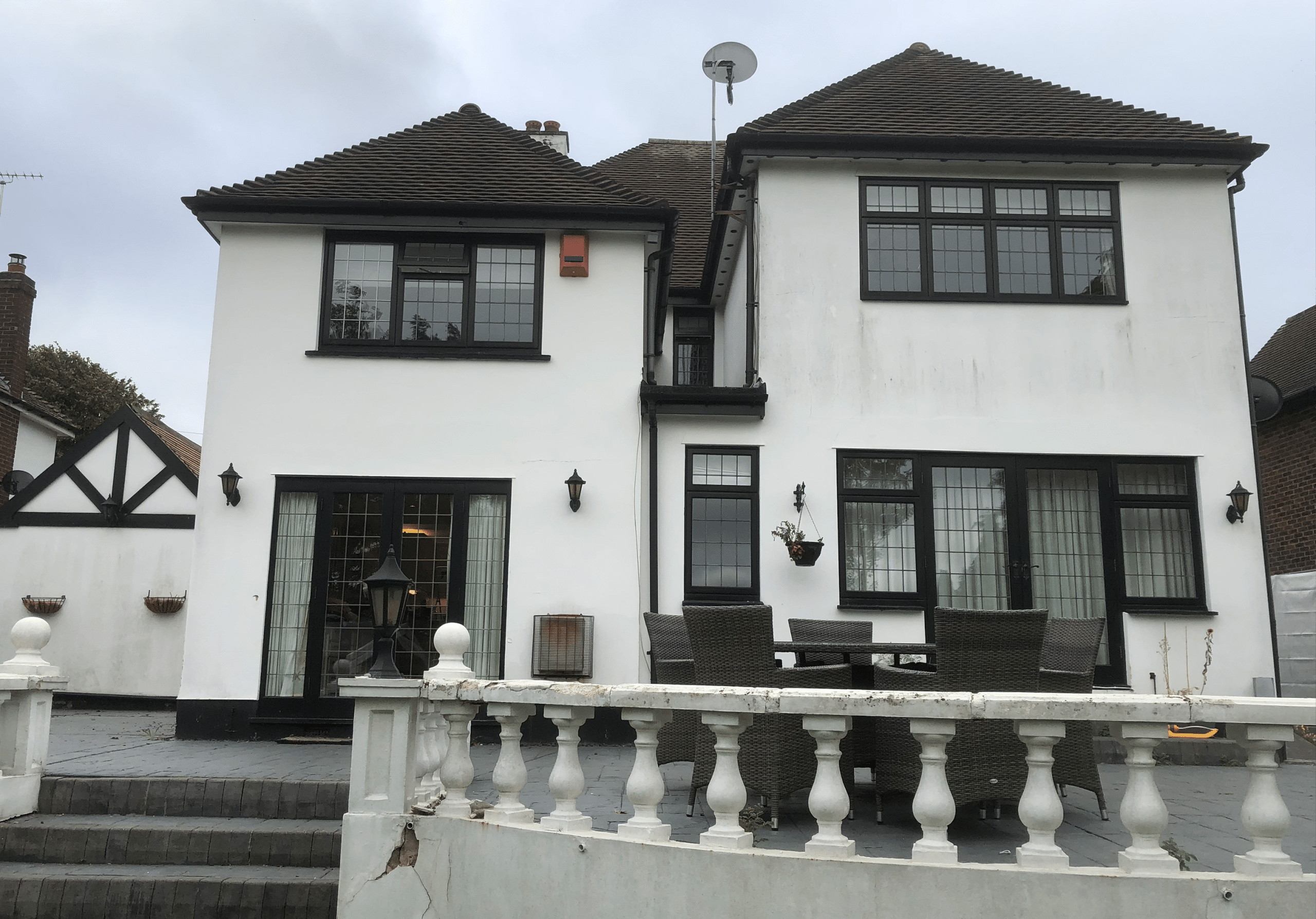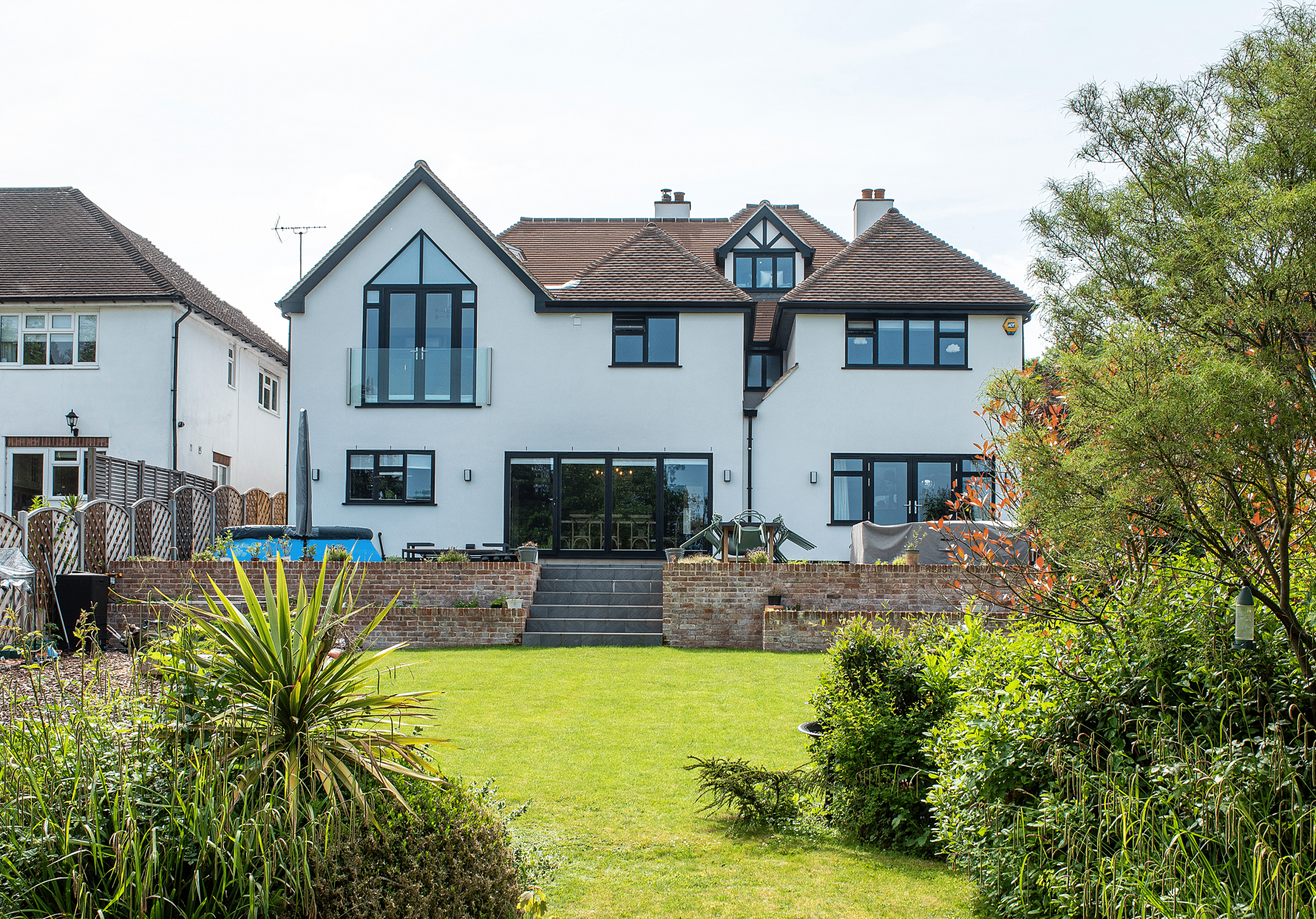 Our client desperately needed more space for their family and wanted to create a home where the space worked more efficiently for their day-to-day needs. To achieve this, their home required both complete exterior and interior refurbishment, comprising of a double storey extension, loft conversion, new roof and complete alteration to the ground floor and upstairs layout. The tired exterior was enhanced and extended with creative architecture incorporating a full height glazing panel encompassing both ground floor and second floors filling the new extension with light. The double storey rear extension and reconfiguration gave our clients a large open plan, family living space, boldly decorated and the look completed with a modern, bespoke Kitchen and large island finished with statement marbled worktops. The introduction of bifold doors and full height glazed doors with Juliette balcony at the rear of the property are a total design triumph filling the space with so much light and incorporating the garden views.