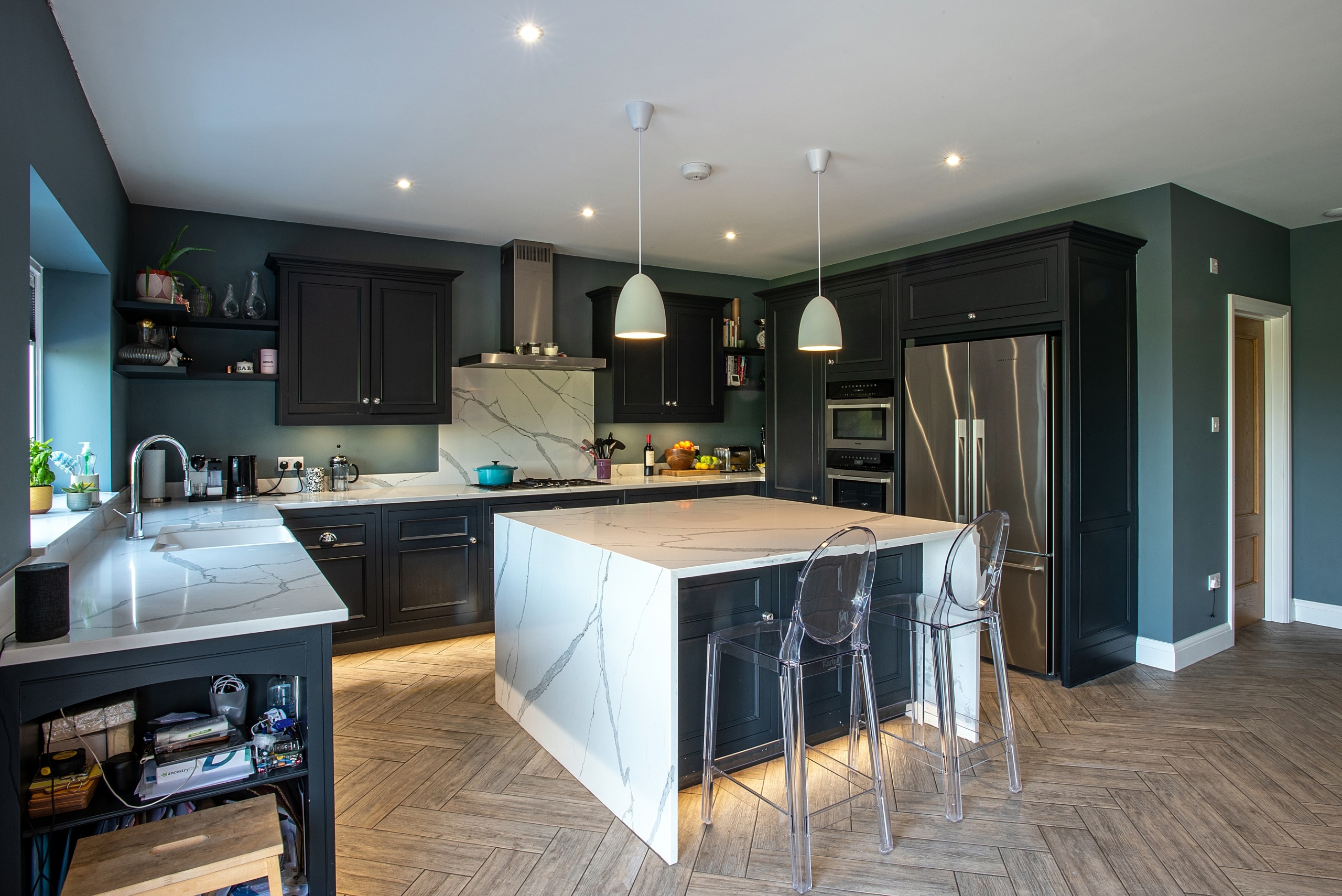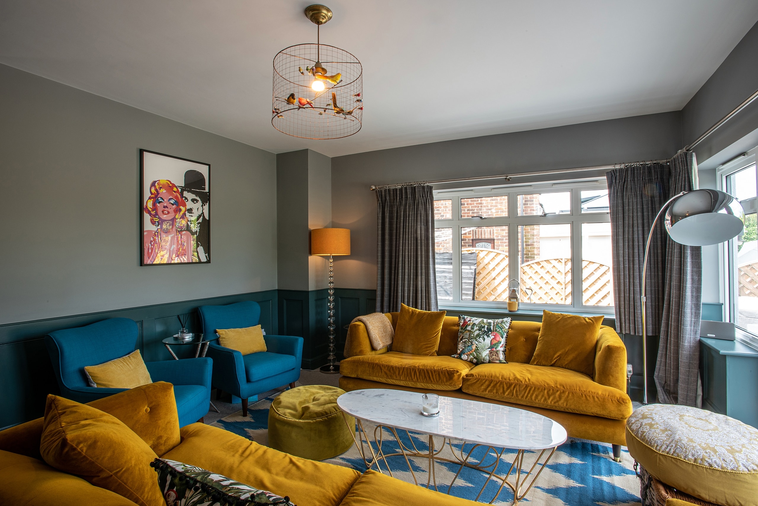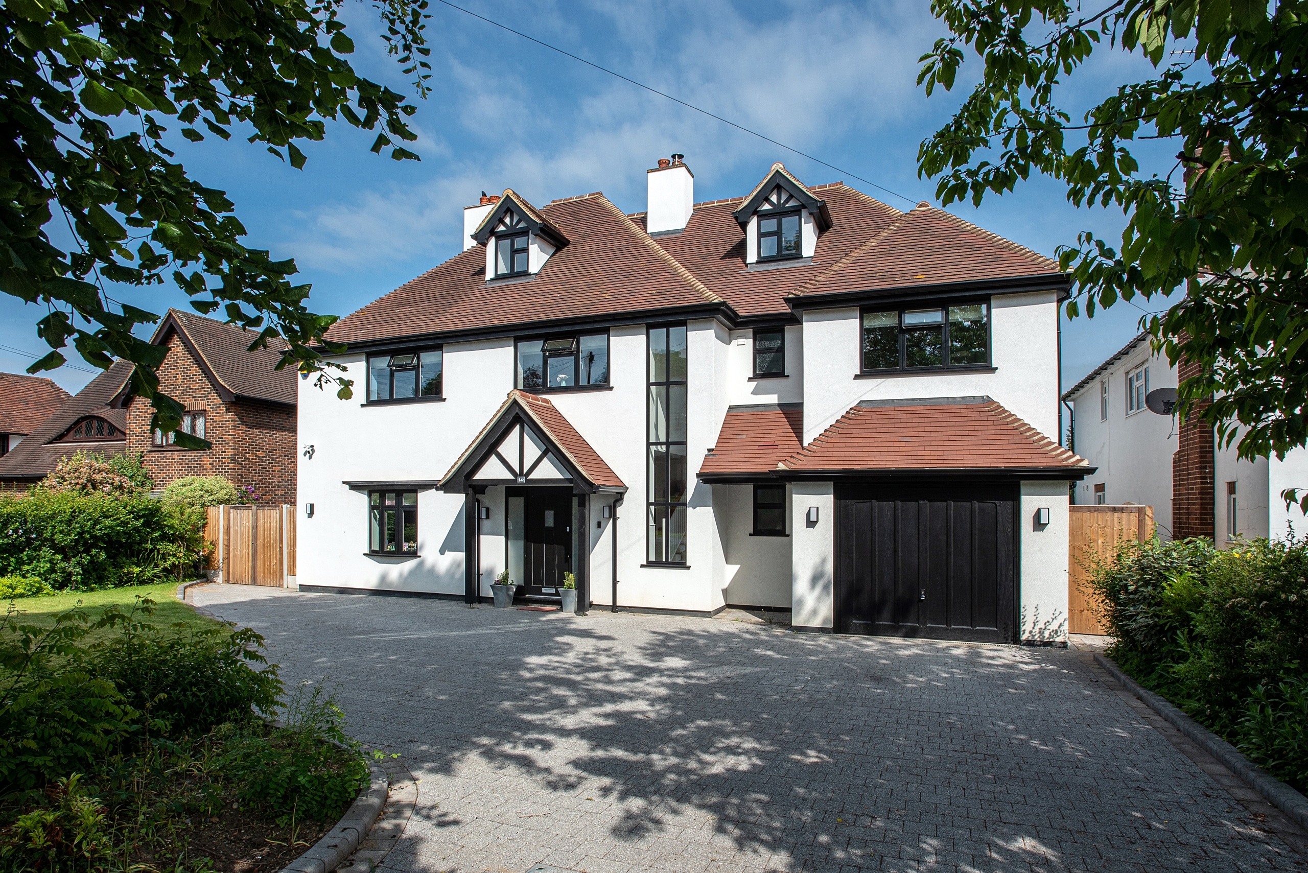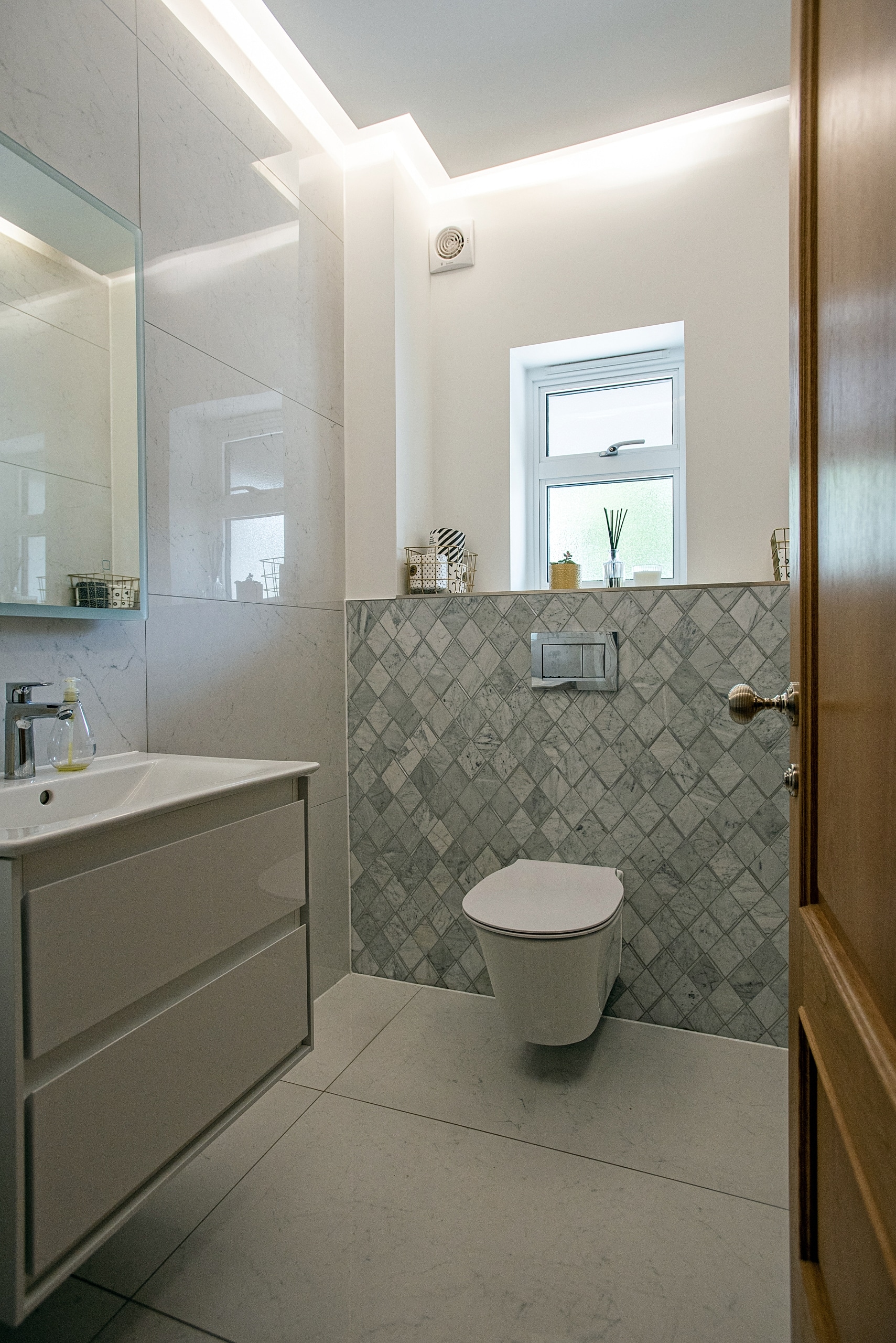 Our client desperately needed more space for their family and wanted to create a home where the space worked more efficiently for their day-to-day needs. To achieve this, their home required both complete exterior and interior refurbishment, comprising of a double storey extension, loft conversion, new roof and complete alteration to the ground floor and upstairs layout. The tired exterior was enhanced and extended with creative architecture incorporating a full height glazing panel encompassing both ground floor and second floors filling the new extension with light. The double storey rear extension and reconfiguration gave our clients a large open plan, family living space, boldly decorated and the look completed with a modern, bespoke Kitchen and large island finished with statement marbled worktops. The introduction of bifold doors and full height glazed doors with Juliette balcony at the rear of the property are a total design triumph filling the space with so much light and incorporating the garden views.