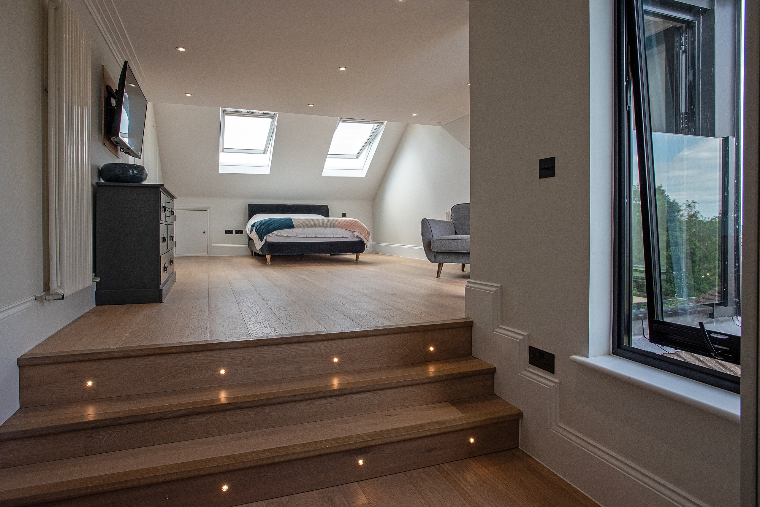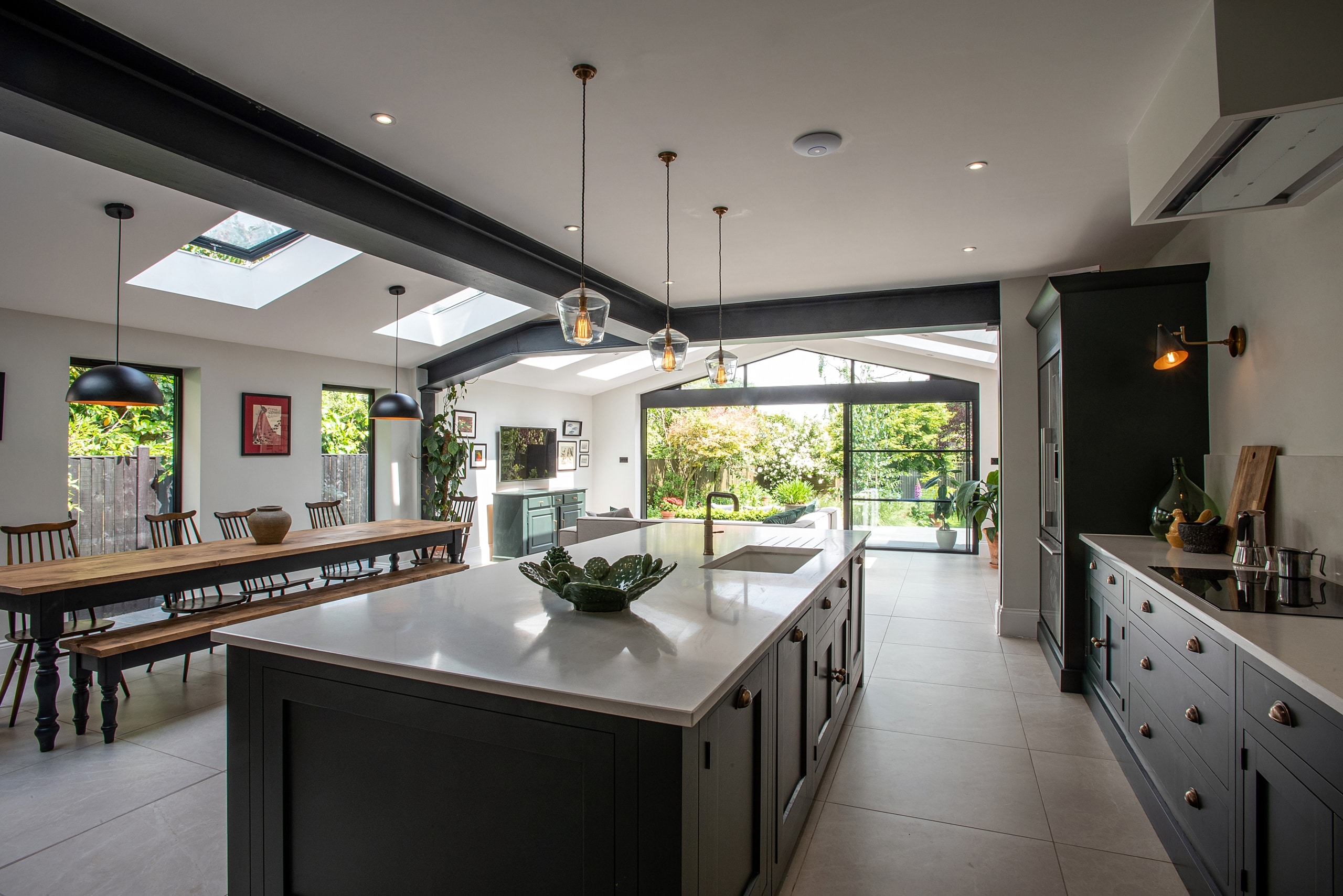 Transform this tired, semi-detached, two storey house to give our clients a huge open plan, family living space, complete with modern, bespoke Kitchen and fully functional island. Total renovation throughout and creation of an additional split level Master bedroom with balcony. This complete enhancement was achieved with a single storey extension and loft conversion.