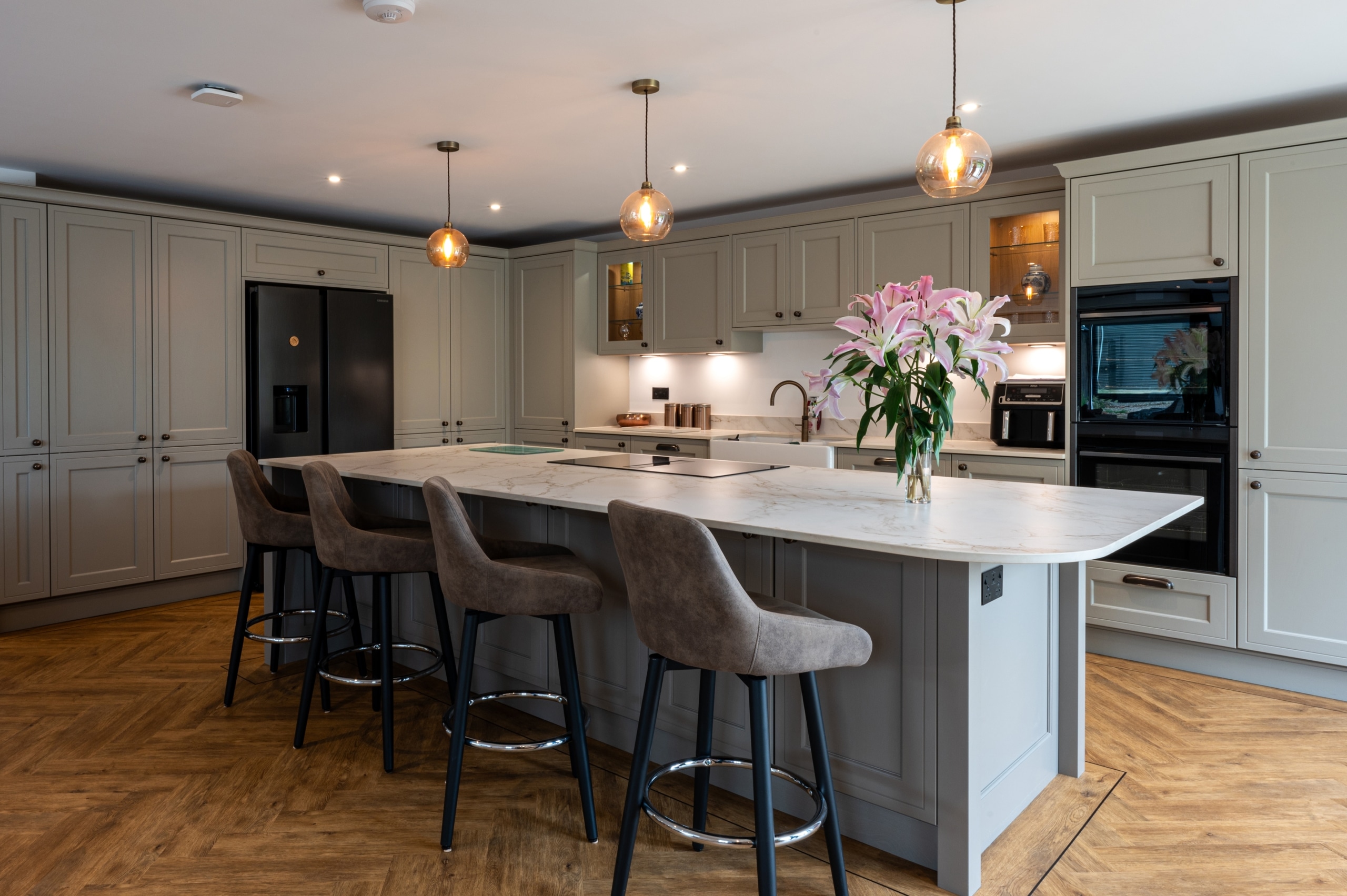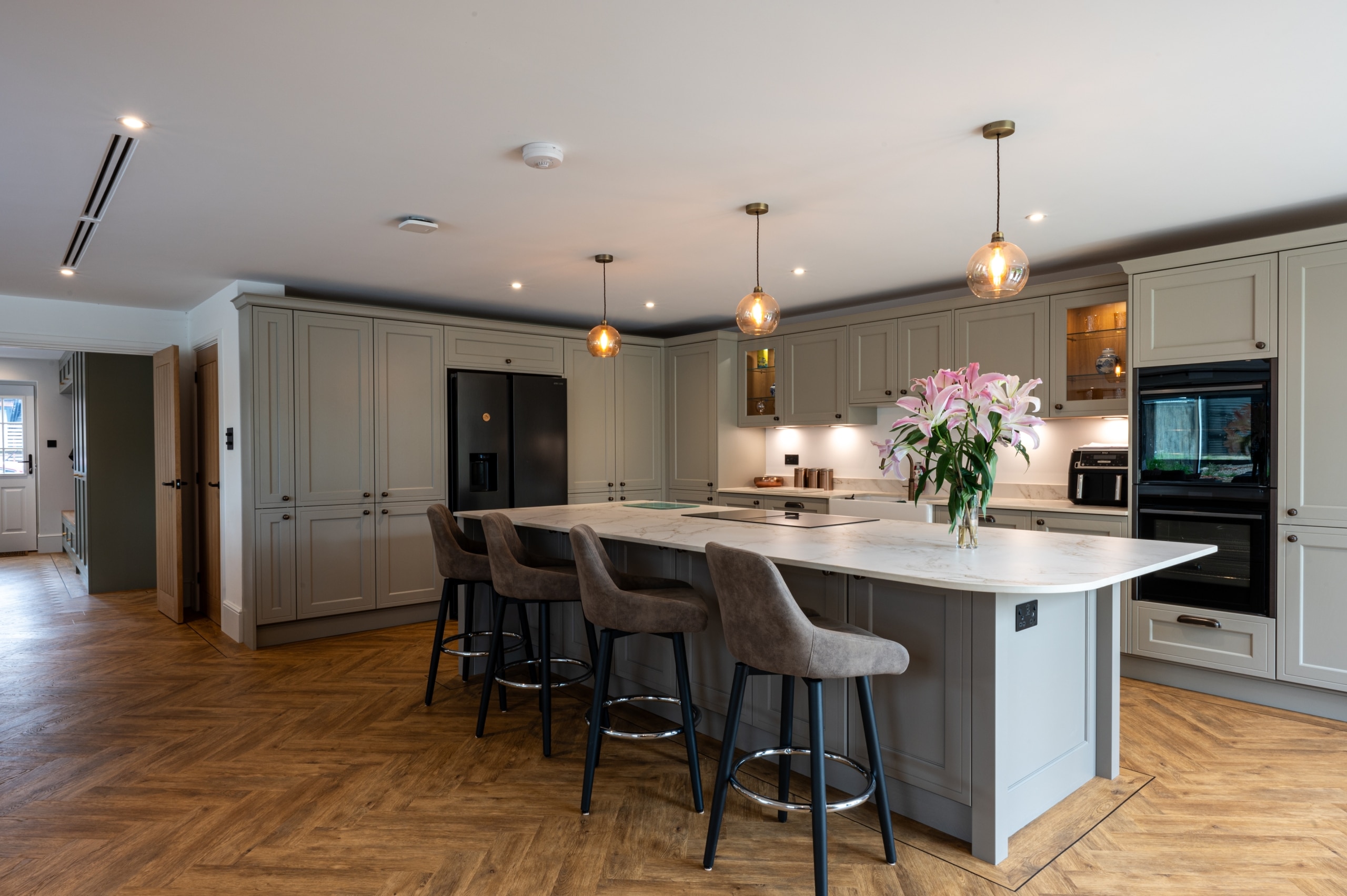 Our client purchased this detached property with a view to restore this former Georgian Farmhouse to its former glory. The property was sympathetically renovated throughout. The exterior brickwork of the property was refurbished with an acid wash and new pointing. The Roof had all new Roof tiles reinstated to complete the external works. The old Georgian bar windows were replaced with sympathetic period-styled modern glazing with simple white frames and stunning matt black hardware. The single-storey rear extension gave our clients a huge open plan, family living space, complete with traditional shaker Kitchen and large island. The addition of two sets of bifold doors are a total triumph filling the space with light and making the most of the beautiful garden views. Total renovation throughout coupled with bold interior design choices in each of the four bathrooms create a stunning family home. The complete enhancement was achieved with both a single-storey and double-storey extension.