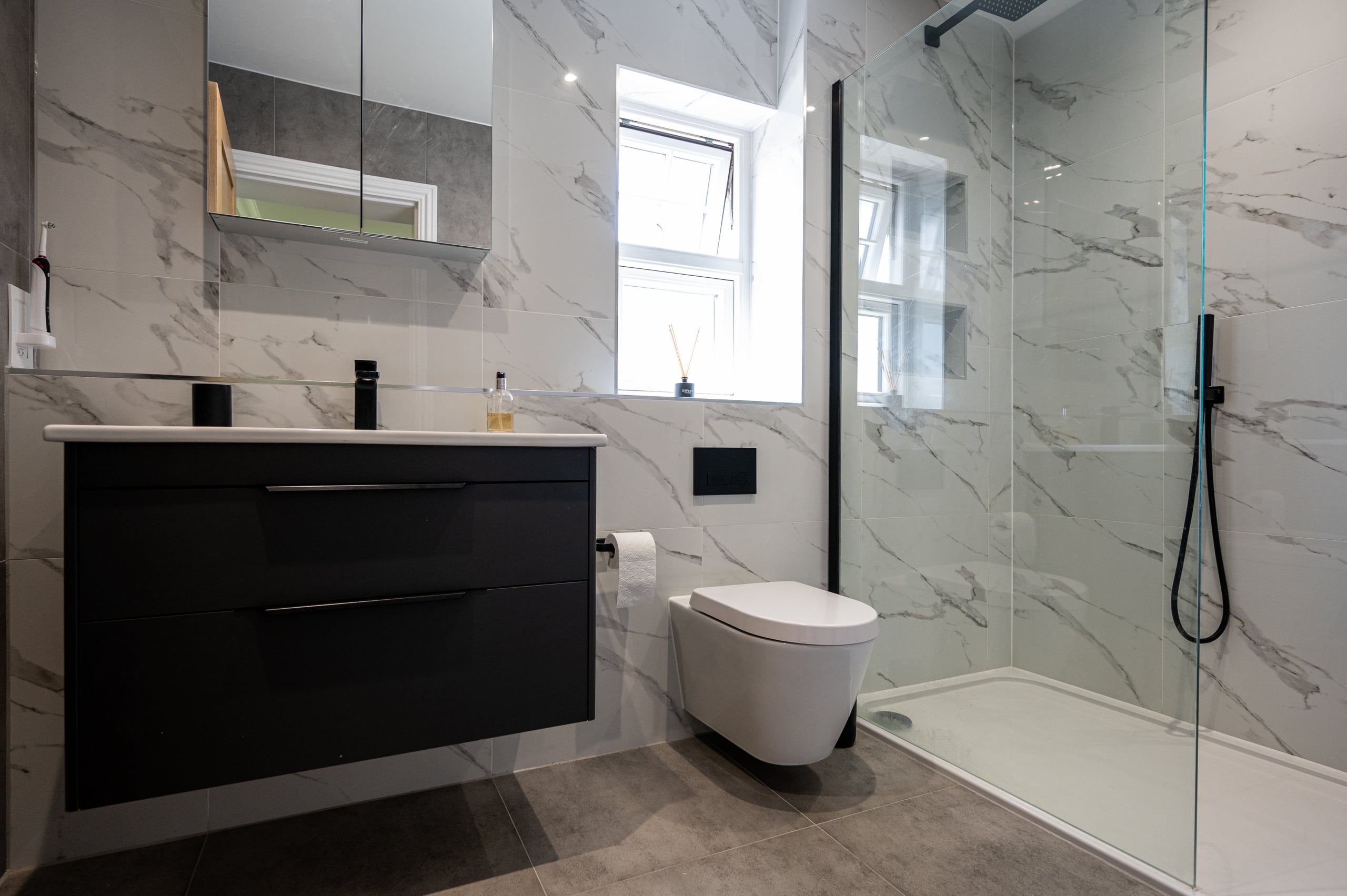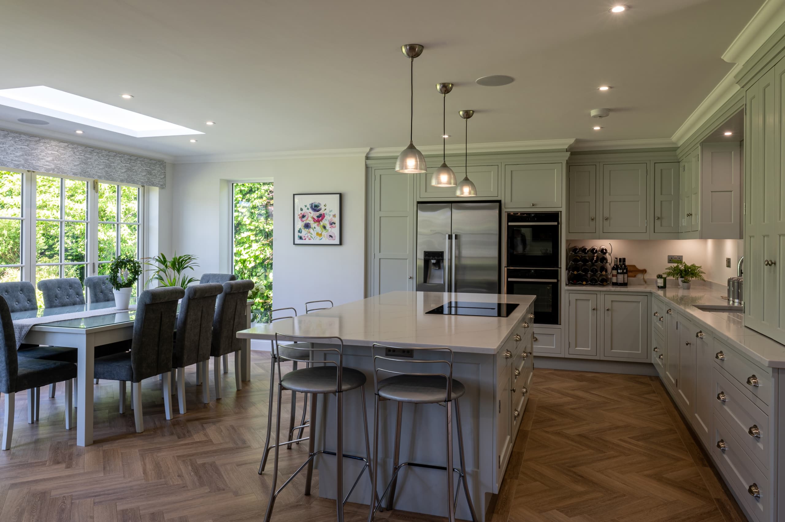 Our client purchased this detached property with a view to completely modernise it throughout. The 1970’s Hutton Mount modernisation project’s exterior was completely transformed using beautiful architecture and design and quality finishing. The old PVC glazing was replaced with a contemporary take on traditional Georgian window design with the addition of a beautiful orangery at the rear, complete with glass lantern and bespoke half-panelled bi-fold doors. The double and single-storey extensions provided much-needed space and filled the property with light and warmth. The cleverly designed rear of the property ensured a flow between spaces and gave our clients a light and bright entertaining, dining and family living space, complete with a traditional bespoke Shaker-style Kitchen and large island. Total renovation throughout coupled with a nod to traditional materials and introduction of modern pieces creates a perfect family home that is both functional and beautiful. The complete enhancement was achieved with considerable demolition and creation of both a single storey and double-storey extension.