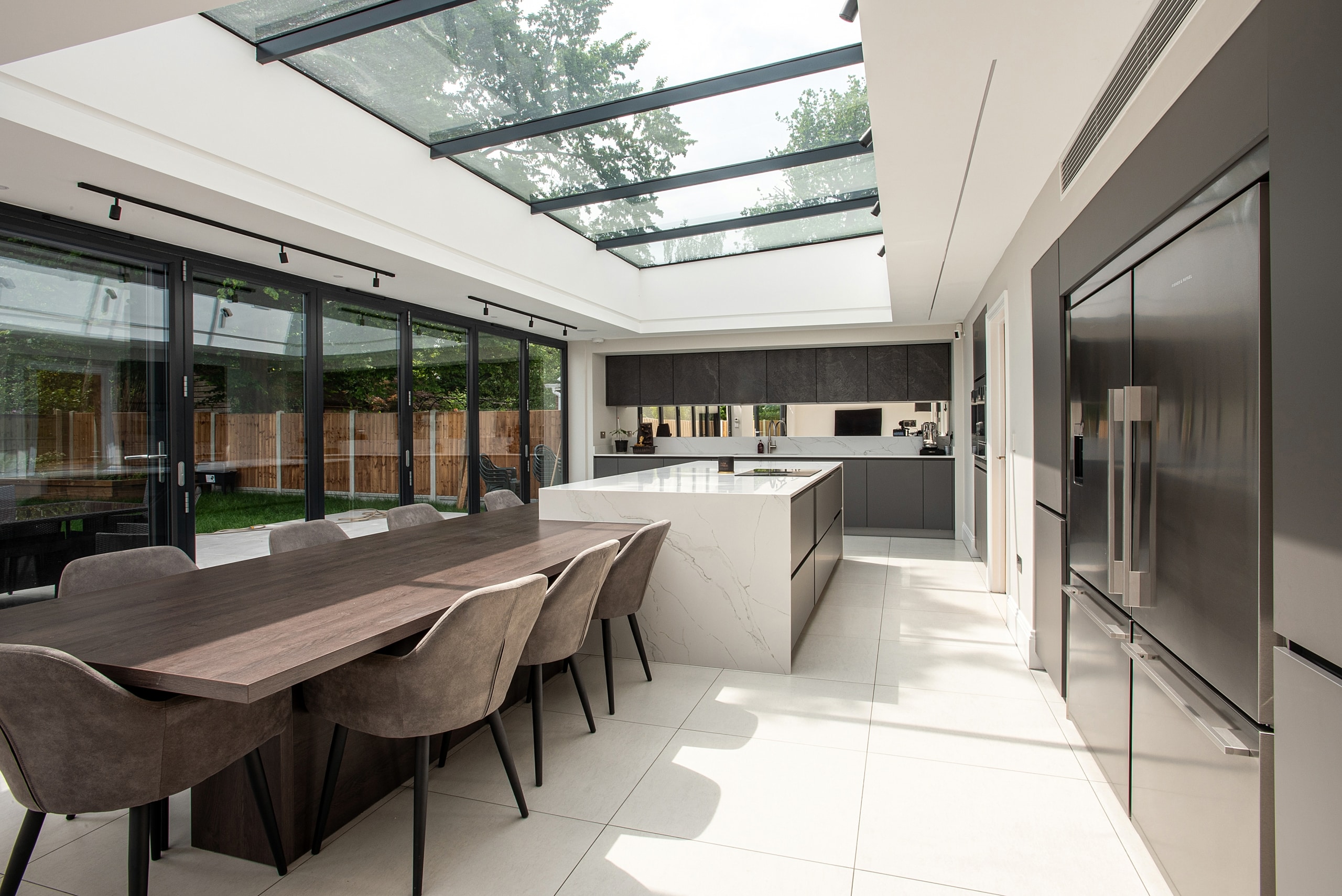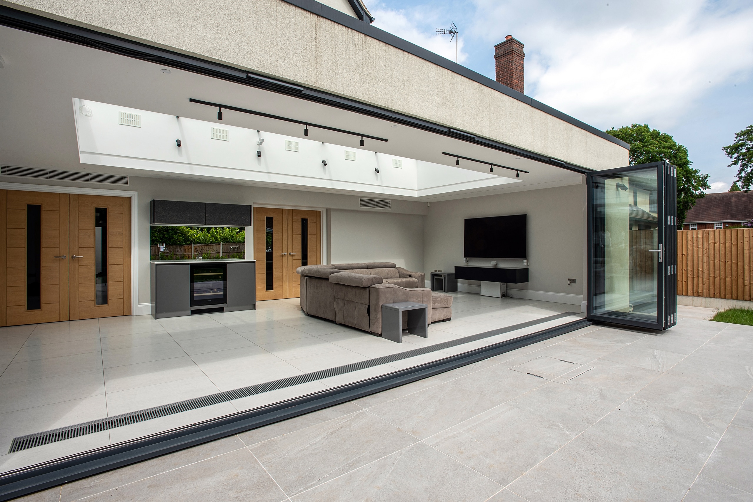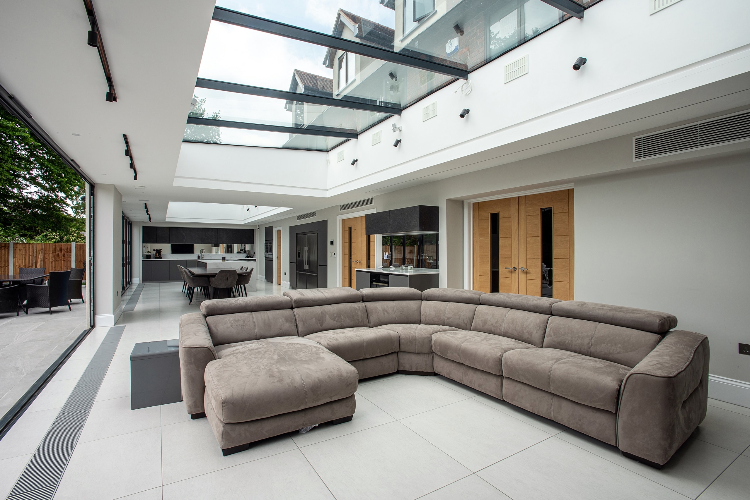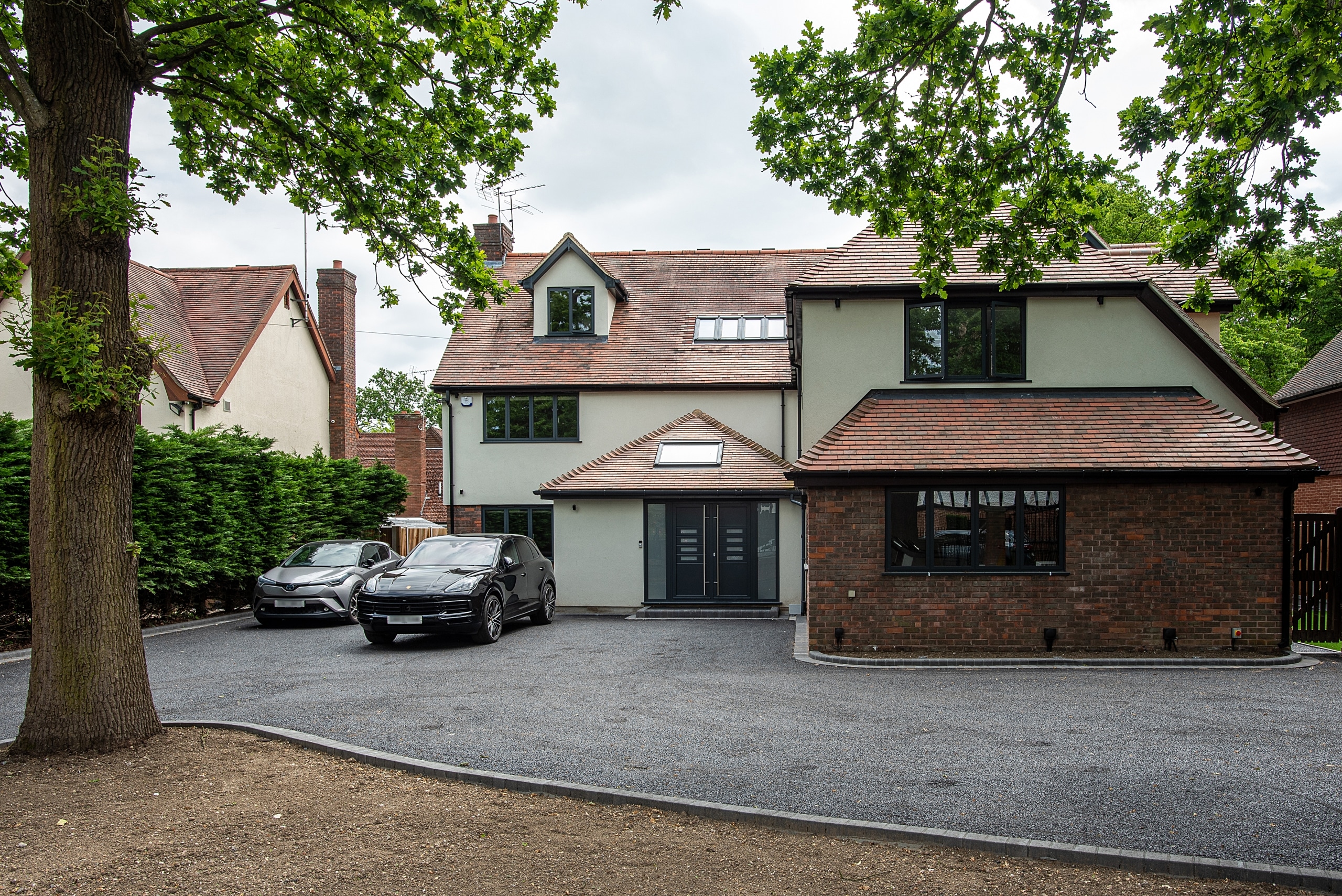 Our client’s purchased this detached property with a view to completely modernise it throughout. The dark tiled and red brick exterior was completely transformed in part using a light render finish. The old Mahogany, Georgian bar glazing was replaced with modern glazing with simple black frames. The single storey rear extension gave our clients a huge open plan, family living space, complete with modern, bespoke Kitchen and large island. The full width bifold doors combined with the large glazed lantern are a total triumph filling the space with light and garden views. Total renovation throughout coupled with the bold creation of a stunning floating staircase with glass balustrade, framed by a floor to ceiling internally tiled wall is a designer’s dream. The complete enhancement was achieved with both a single storey and double storey extension and loft conversion.